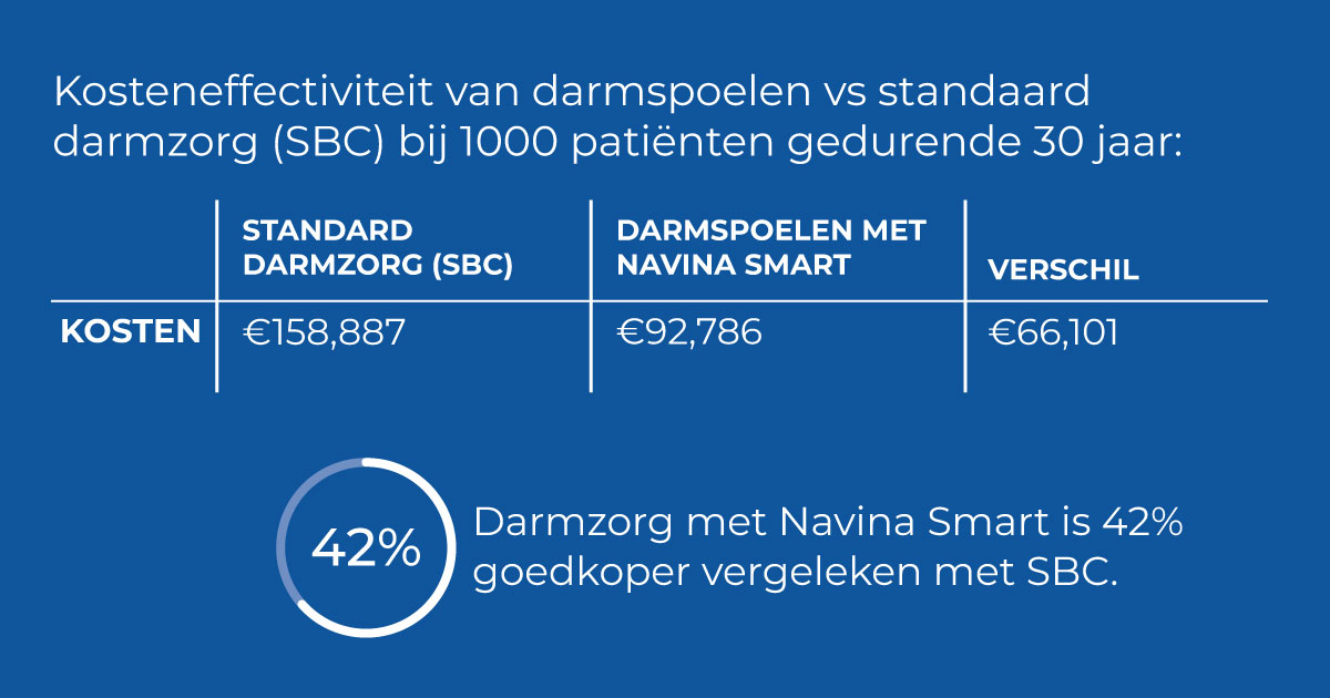 Bij een WTP van €35.000 per QALY leverde darmspoelen met Navina Smart een potentiële besparing op van €66.101 en 0,43 QALY’s per patiënt over 30 jaar. Dit ging gepaard met een lagere kans op operaties, stoma’s, complicaties en zorgbezoeken. De NMB werd geschat op €81.087 per patiënt over 30 jaar.