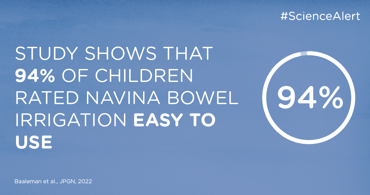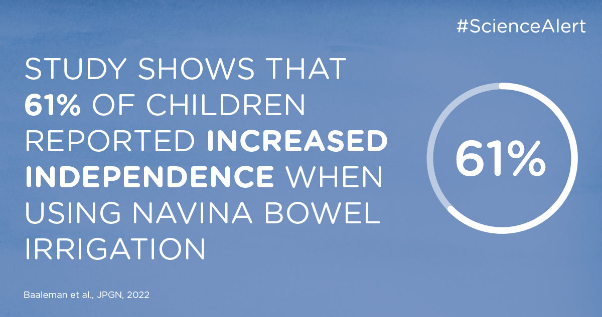 Nieuw in dit wetenschappelijk onderzoek is dat factoren zoals onafhankelijkheid, ervaringen en empowerment van de patiënt ook werden onderzocht. De meerderheid van de kinderen (61%) rapporteerde dat sinds het gebruik van de Navina darmspoelsystemen hun onafhankelijkheid was toegenomen. Het gebruik werd door 94% van de kinderen als gemakkelijk of zeer gemakkelijk beschouwd. De empowerment van de patiënt werd gemeten met de Gothenburg Young Persons Empowerment Scale (GYPES) en liet vergelijkbare niveaus zien als bij kinderen met andere chronische aandoeningen. Meer dan de helft van de kinderen vond het gebruik van darmspoelen echter belastend en het meest belastend was de tijd die het kostte.